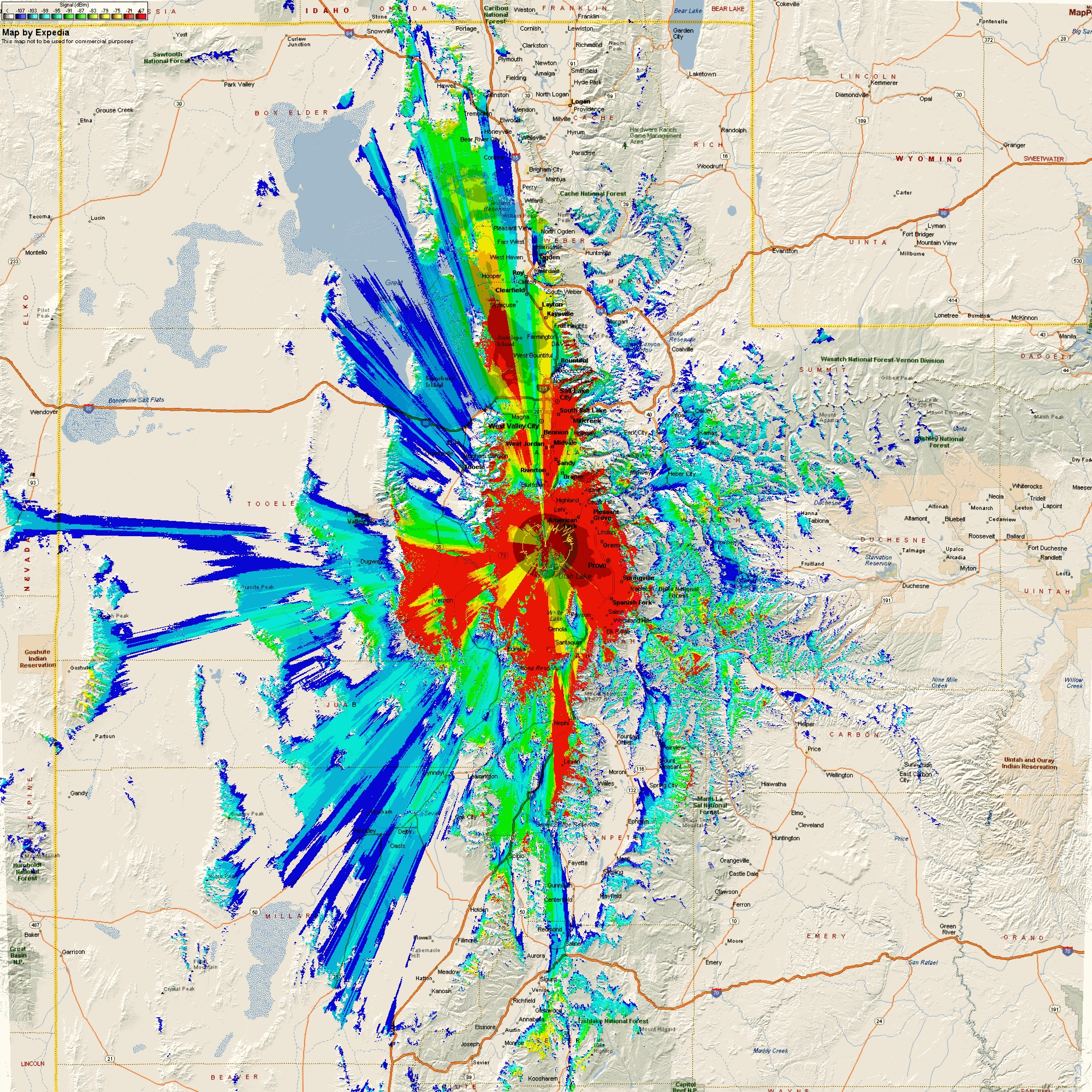 📡 Mobile stations using 50-watt radios and a quarter-wave antenna can expect coverage across Utah and Salt Lake Counties, reaching south toward Fillmore, west into the desert, and as far north as the Idaho border. Terrain eastward into the Wasatch Mountains presents challenges, but coverage can still be achieved in elevated or open spots.